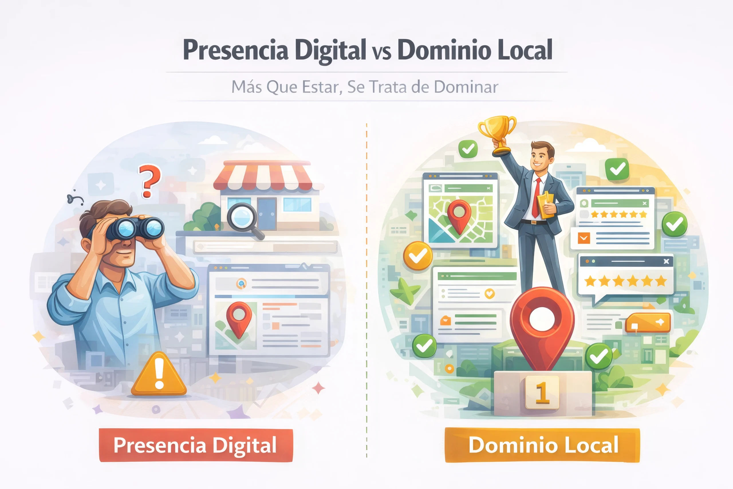 Un negocio con presencia puede aparecer ocasionalmente en algunos resultados. Un negocio con dominio local ocupa espacios estratégicos de forma consistente: resultados orgánicos relevantes, mapas locales, reseñas visibles y menciones confiables dentro de su industria.